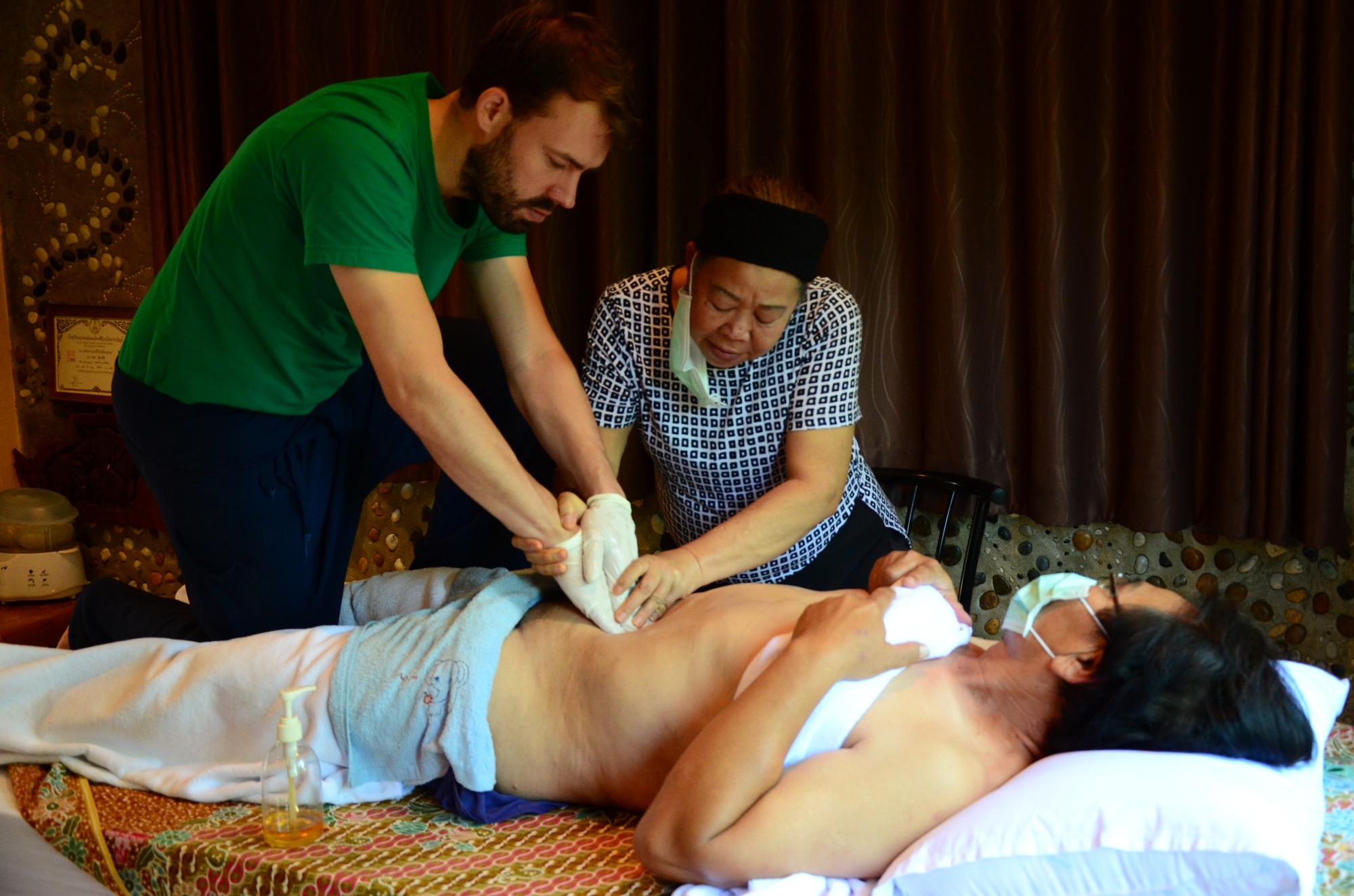 Diese Suche hat mich aber letztlich zu zwei Heilern geführt, bei denen ich erstmals wirklich empfangen und damit große innere Transformation erfahren habe: Von Khun Ni und ihren Schülerinnen in Chiang Mai/Thailand habe ich viele Chi Nei Tsang-Sitzungen empfangen, von Shikha Dhyan in Pune/Indien eine ganze Reihe von Ayurvedic Balancing Bodywork Sessions. Beide sind wahre Meister mit einem so reinen Herzen, überwältigender Klarheit, außerordentlicher, erweiterter Wahrnehmung und Egolosigkeit, dass es mir noch heute die Sprache verschlägt. Dass sie mich dann auch noch als Schüler akzeptiert haben, mir Unterricht gegeben haben – Eine Dusche kosmischen Wohlwollens! Ihnen verdanke ich Alles!